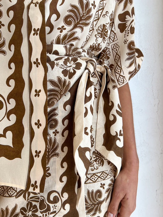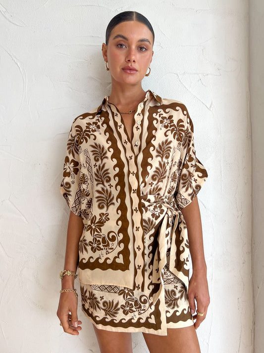 Embrace hot balmy nights with ALÈMAIS Tropic Sarong Mini Skirt in Choc / Cream.