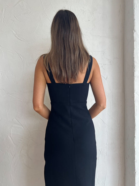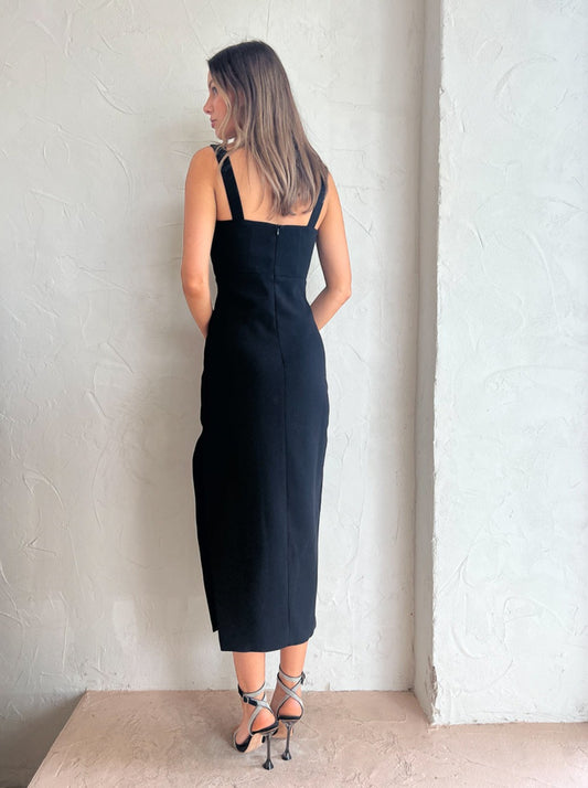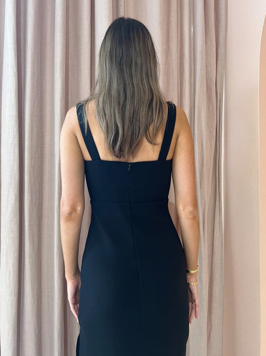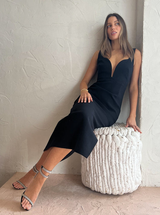 Crafted from a structured crepe fabrication, this full length dress showcases an artistic low cut neckline with internal wiring for additional structure and support.