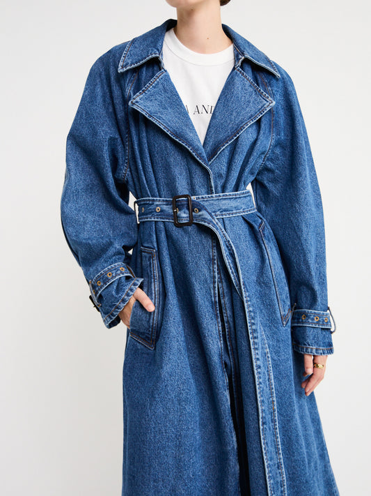 - Denim trench coat with exaggerated shoulder pads