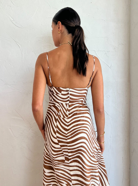 Crafted from a crisp breathable linen fabrication, this Midi dress features adjustable rouleau straps, back invisible zip and a fitted bodice before falling into a relaxed maxi skirt.