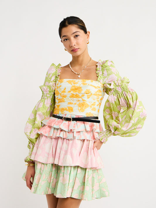 Delicately crafted from a premium cotton fabrication, this mini dress features an exclusive Anemone Splice print, straight neckline, elasticated gathered shoulders and balloon sleeves with an elasticated cuff.