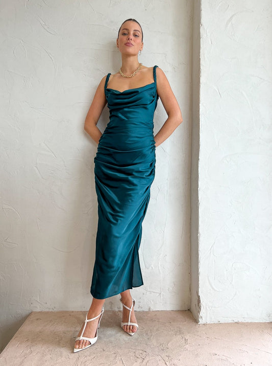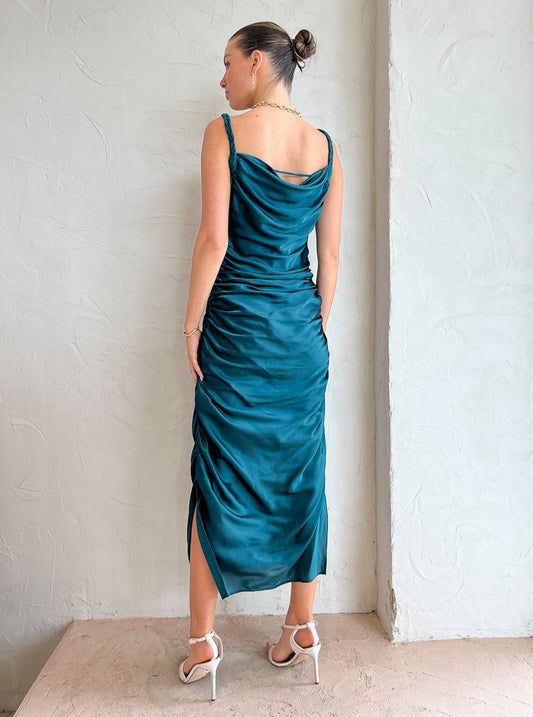Crafted from premium silk, this exquisite midi dress features a cowl neckline, braided straps and ruched bodice to provide a touch of sophistication and is finished with a side skirt split to create movement with every step.