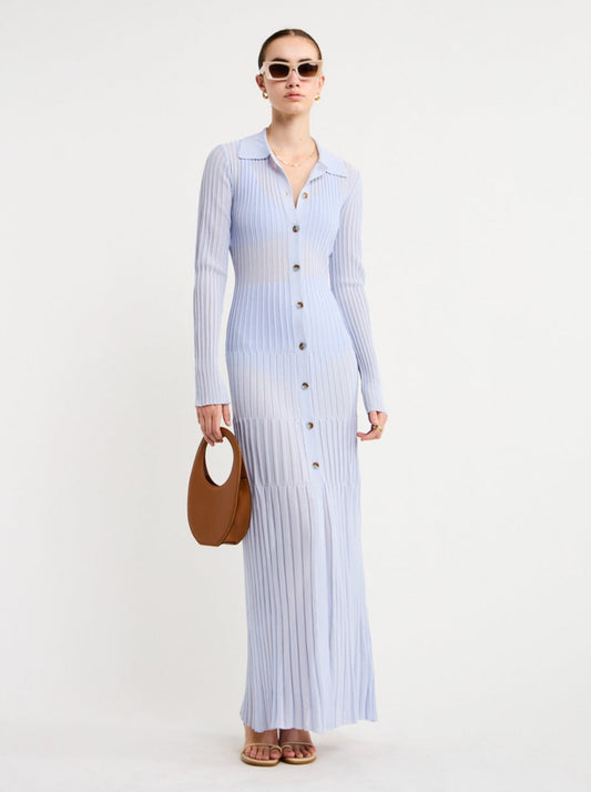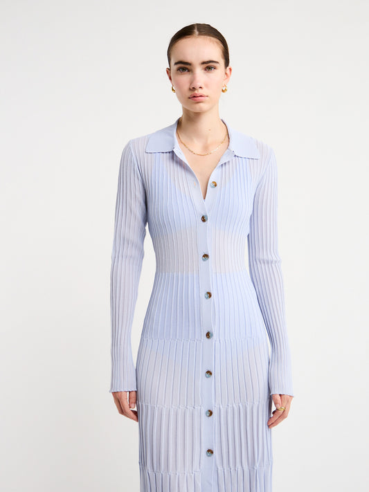 Invest in soft tonal hues and luxe layering essentials with the Eva Buttoned Midi Dress in Ice Blue by SIR.
