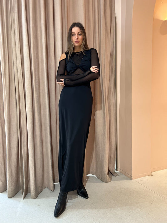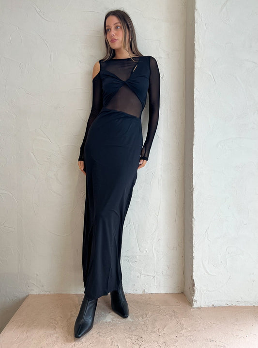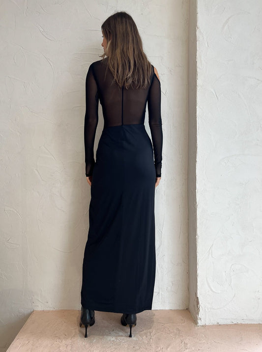 Crafted from a mesh jersey fabrication that will flatter your silhouette with its slinky drape, this maxi dress features a high neckline, soft mesh panels and asymmetric cutouts.