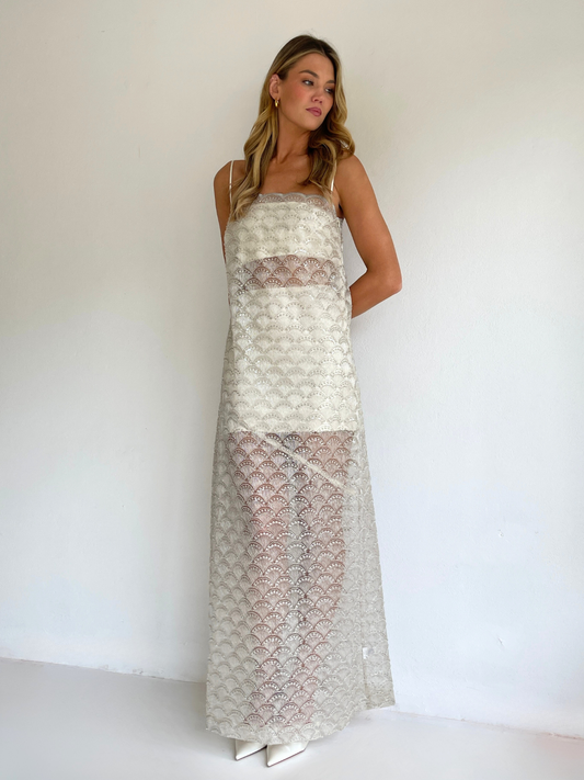 The Arley Everly Maxi Dress in Metallic/Ivory is made from a specialty beaded lace. Designed as an easy to wear column dress silhouette.