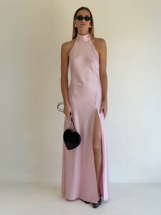Simple, elegant, and effortlessly polished — the Esme Maxi Dress by By Nicola is designed for modern occasions. Crafted in a soft powder pink, this full-length silhouette features a high neckline with a halter-style cut and a subtle side split for ease and movement.