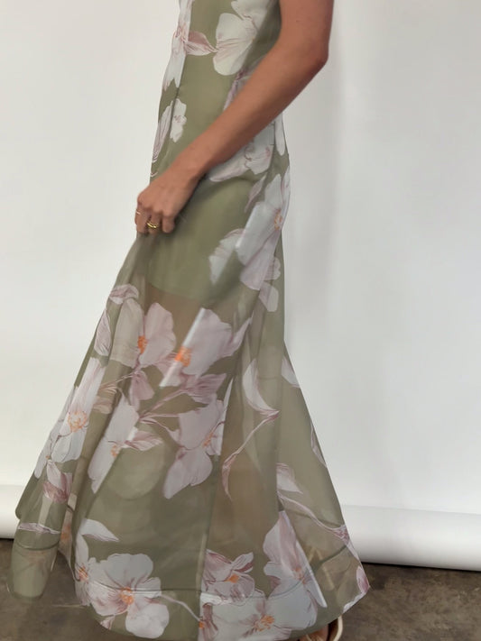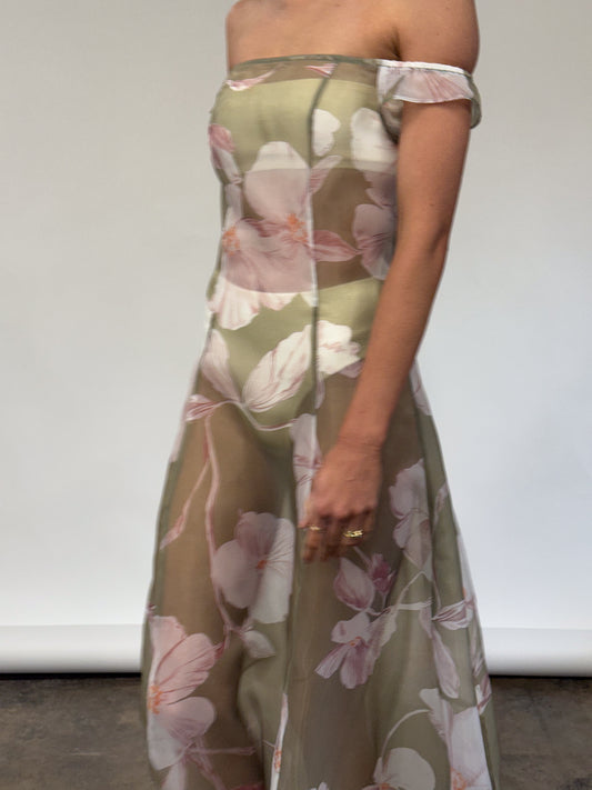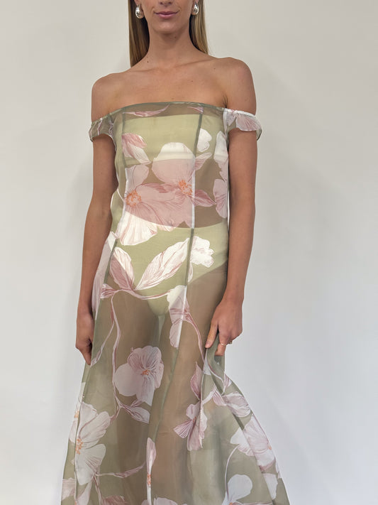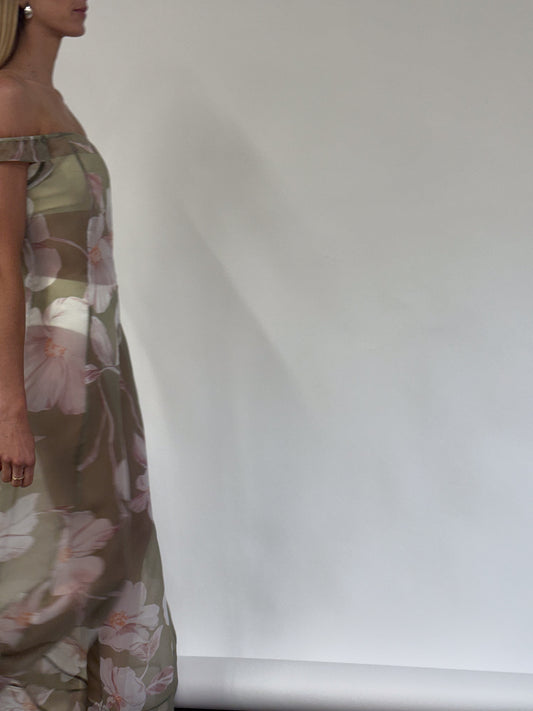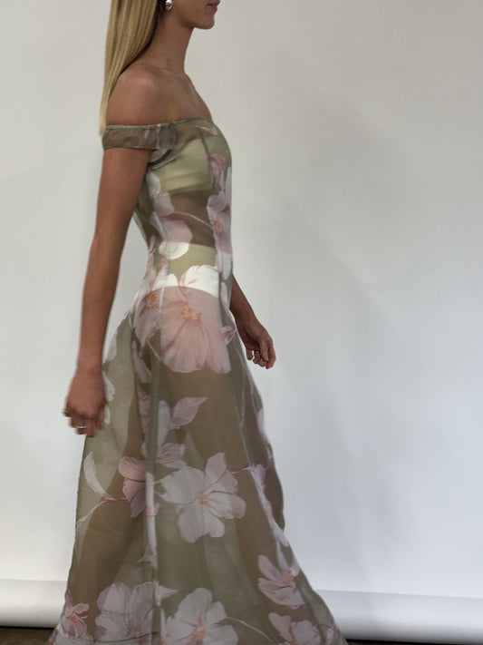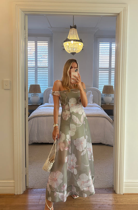 The Clementine Maxi Dress in Peppermint Floral is made of celebration.  A new style to Featuring a classic off shoulder neckline is fitted through the body that falls into a voluminous skirt with body and movement.