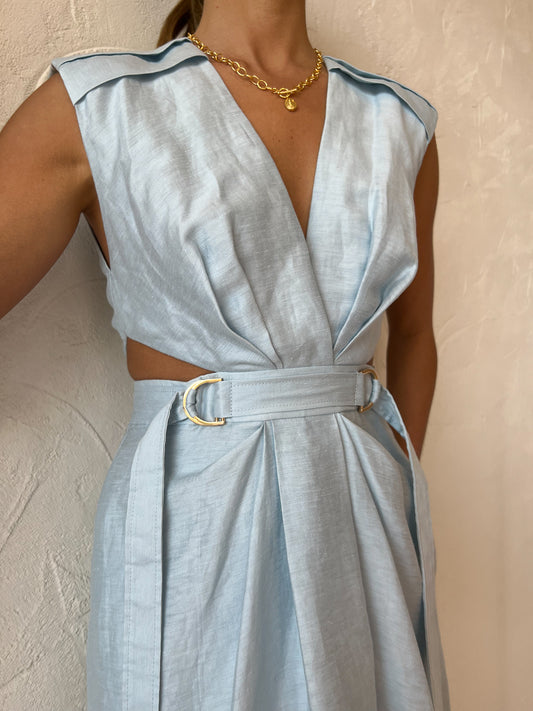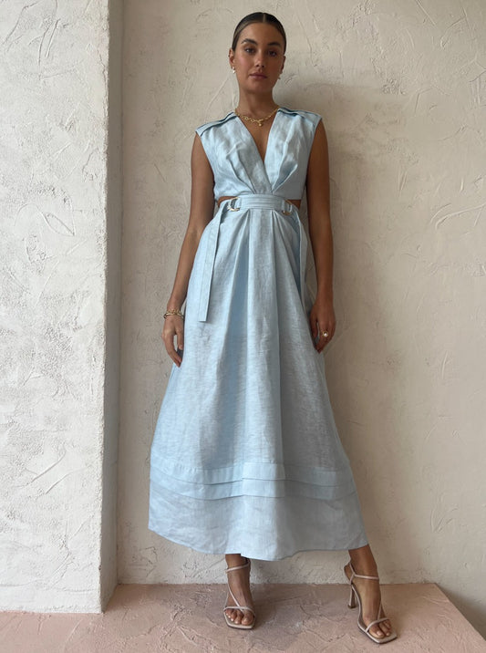 Crafted from luxurious Linen blend, this elegant maxi dress is designed to taper through the waist with a feature signature belt before falling softly into an A line skirt. Cut with a V neckline, it features folds throughout, pin tuck bust details and side pockets.
