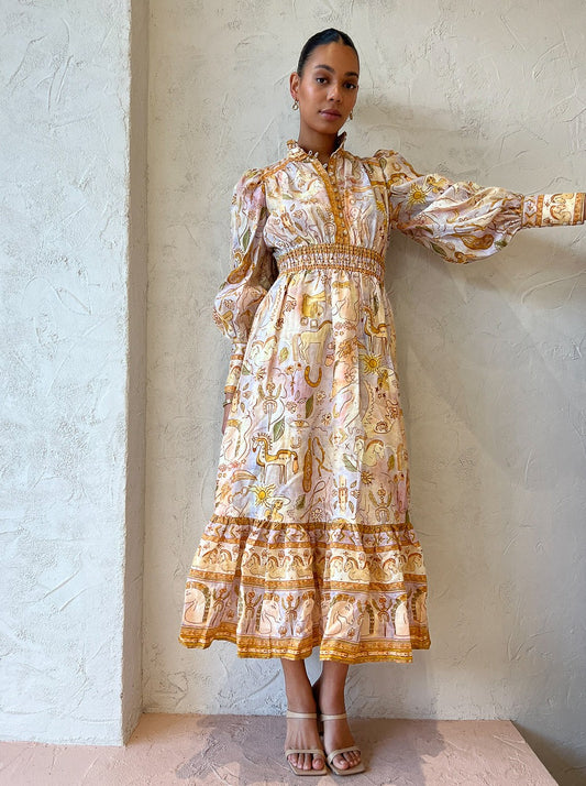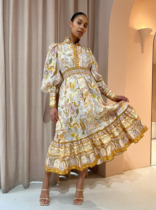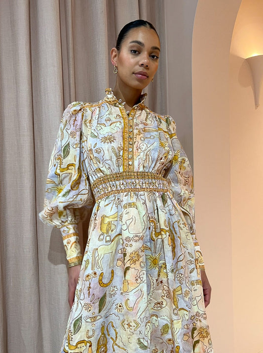 Thoughtfully crafted from a lightweight and airy linen fabrication it features colourful spills of colour and intricate motifs. This shirt dress silhouette features a neck stand with pin tucks, blouson sleeves with fitted cuffs and a shell button with loop fastening through the front.