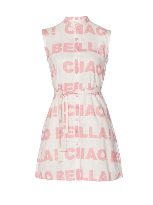 Crafted from Linen with an Exclusive Ciao Bella print, this sleeveless mini dress is made for sunshine days. Featuring a grandfather collar, button front placket and a detachable belt to accent the waist.