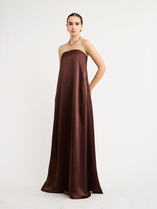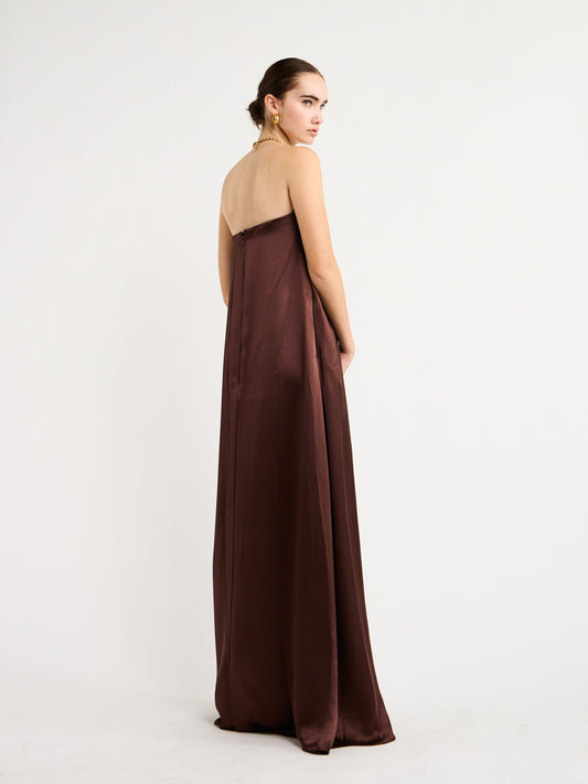 Falling to a floor sweeping hem in a rich chocolate hue, its timeless design is perfect for weddings, formal soireès and cocktail hour.