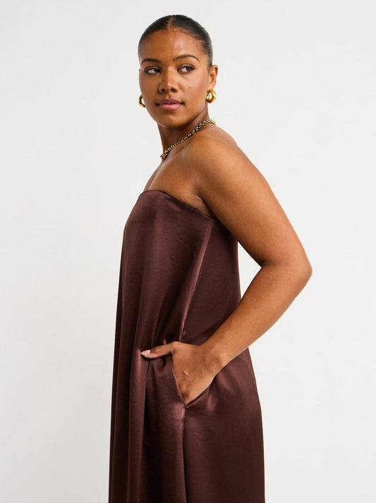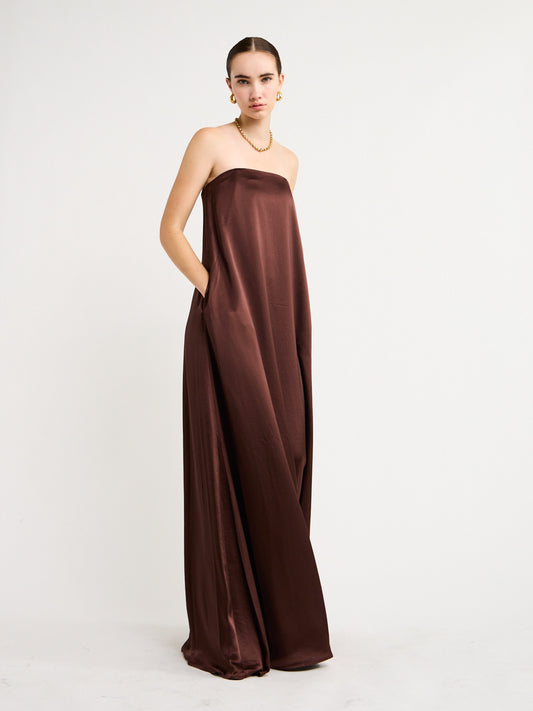 Crafted from a satin fabrication with a lustrous finish, this maxi dress features a statuesque column cut with a strapless neckline, fitted internal bodice and finished with internal pockets.