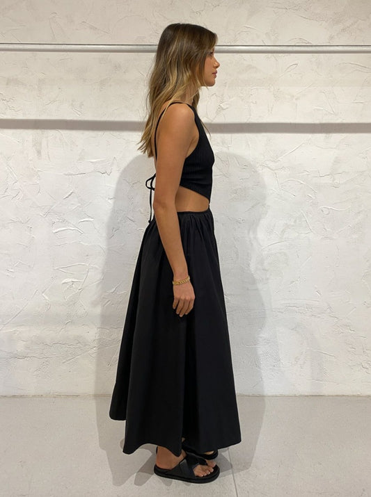 Designed to fit tight to the bodice and high on the neck, this maxi dress is crafted from a stretch rib fabrication that contrasts from the cut out waist, falling into a relaxed maxi length cotton skirt.