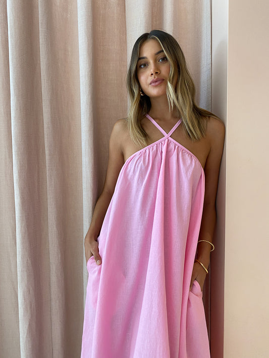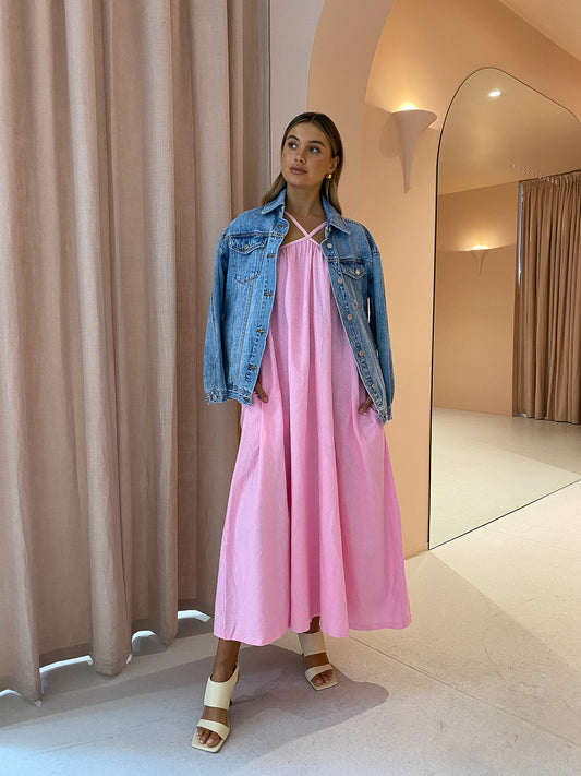 Crafted in a 100% candy pink cotton, this floaty and dreamy maxi is a one sized and features internal side pockets for an extra touch.