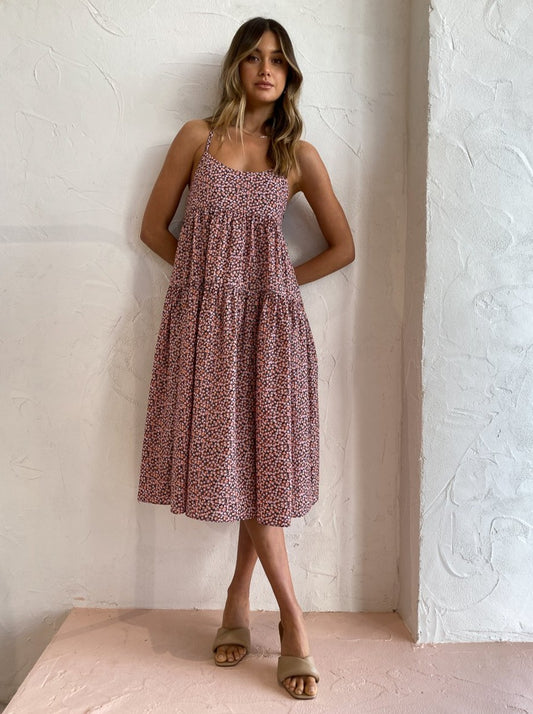 Cut from Cotton in a sweet midi length silhouette and featuring a scoop neckline and Rouleau straps falling into a voluminous tiered midi skirt, the Acacia Midi is a
