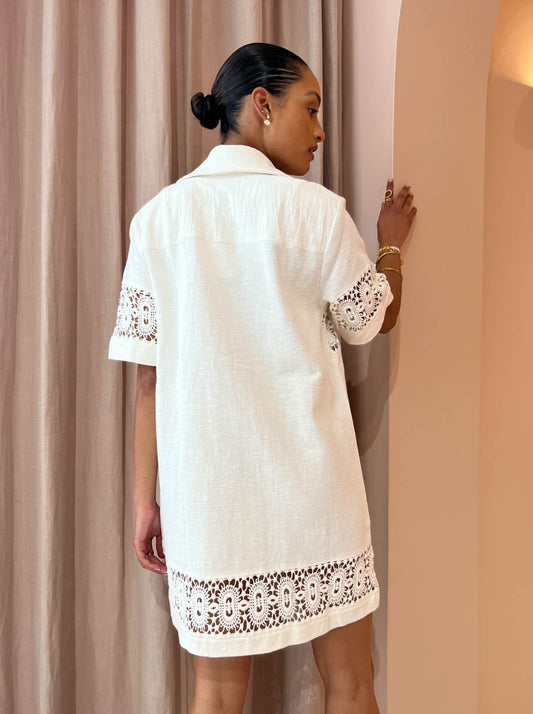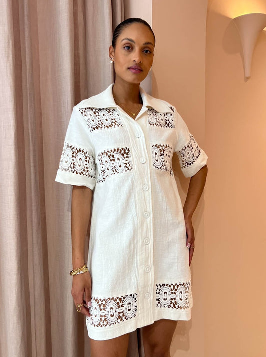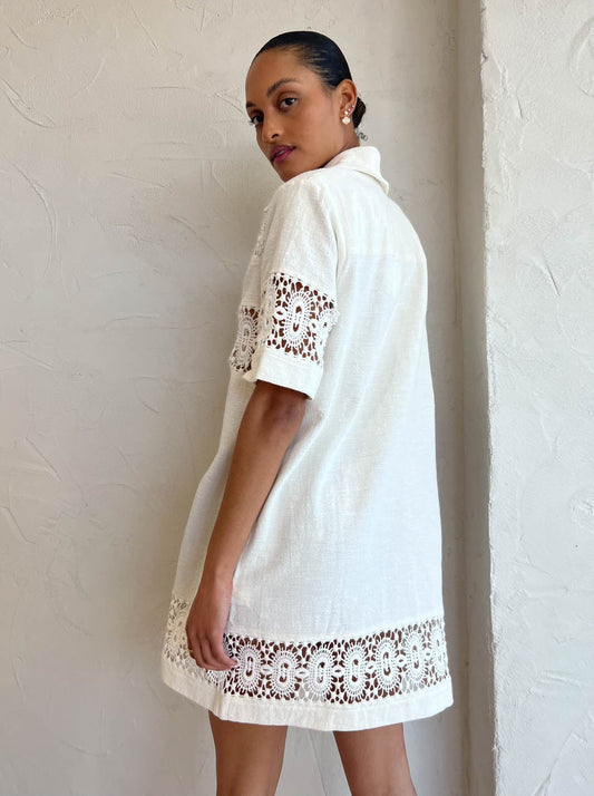 Crafted from Linen Cotton blend fabrication, this boxy shirt dress features intricate embroidery, an oversized collar and centre front buttons.