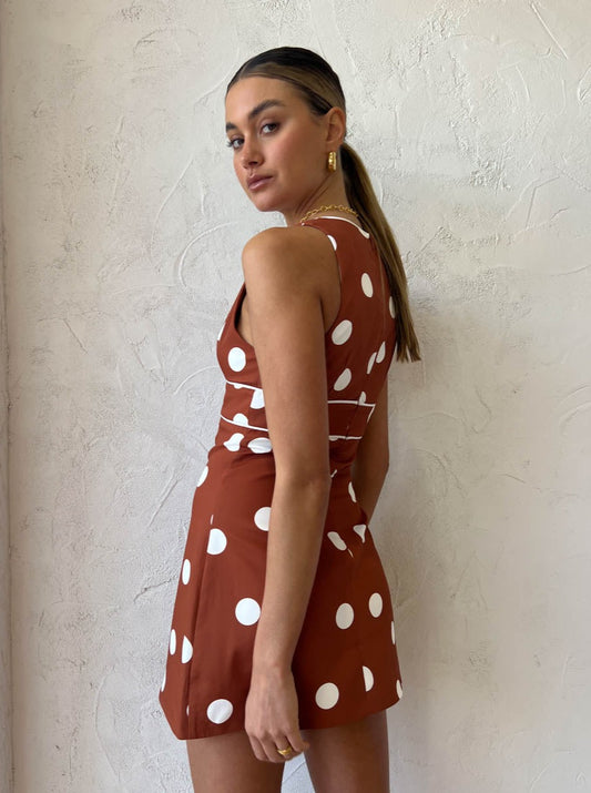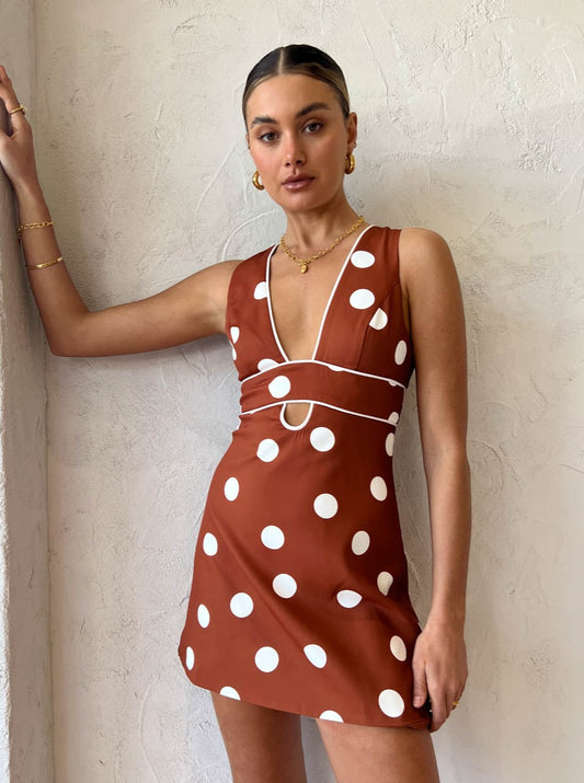 Adorned with a tonal feminine spot print, this figure flattering mini sits fitted at the bust with a flattering v neckline, waistband and centre front cutout before falling into a A-line mini silhouette.