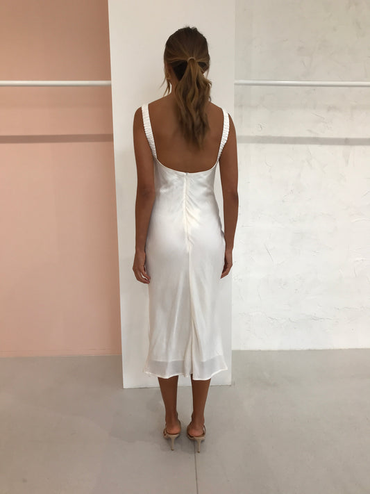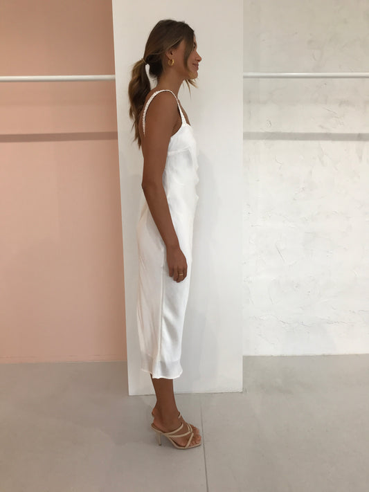 The By Nicola Allure midi dress in Ivory is a classic slip dress with thick straps and sleek scoop back. Crafted from a subtle shine cupro/poly blend, this piece is fully lined for your comfort.