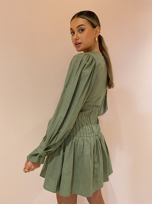 Fluting out in a gathered mini skirt, this Exclusive moment is finished in an earthy Olive hue perfect for day to night styling.