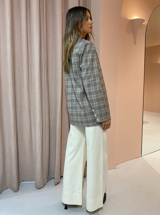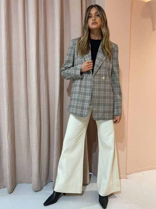 Crafted from a Plaid fabrication, this longline tailored blazer is double breasted and designed to fit oversized on the body. Featuring functional inseam pockets and tortoiseshell button detail.