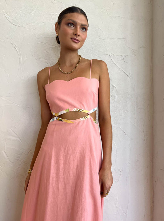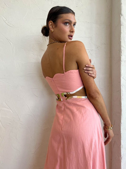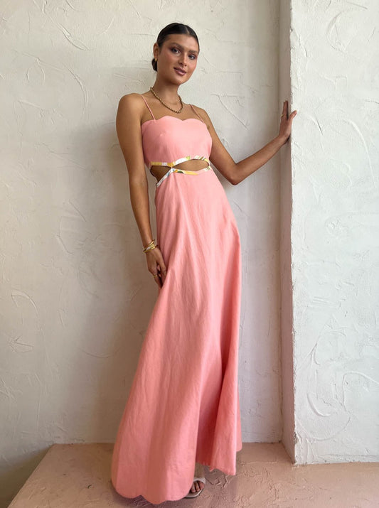 Designed in a Linen Cotton blend, this maxi dress features scalloped edge detailing at the top neckline and bottom hemline with self fabric rouleau straps with adjusters. This dress also showcases a cut out with contrast swirl check print bind at the waist for a statement.
