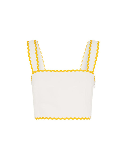 Crafted in a Linen Cotton blend fabrication, this square neck crop top features wide straps and a bright contrast wavy trim along the straps, neckline and bottom hem edge.