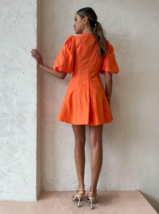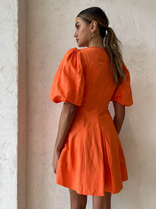 Inspired by coveted silhouettes, this A line mini dress is crafted from a Cotton Linen blend perfect for sun-kissed summer days. Tailored through the bodice before falling into a sweet mini skirt, its signature puff sleeves are complimented with a plunging V neckline that's detailed with a wavy trim.