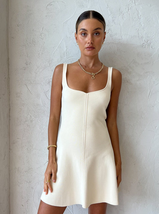 Immaculately cut from a signature crepe knit fabrication, this mini sits fitted around the bust. Featuring a flattering square neckline to highlight the décolletage and backline with double tubular detail down the centre front before falling into a gathered mini hemline.