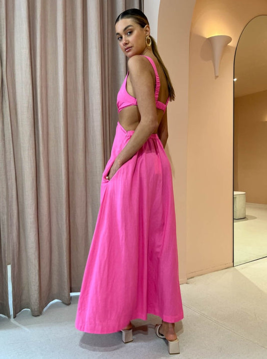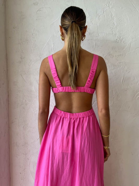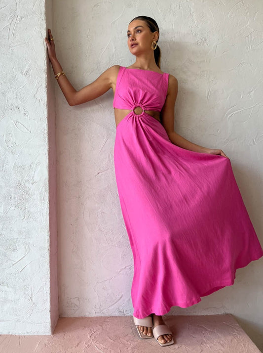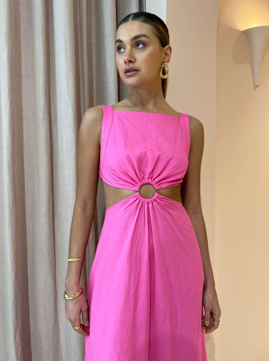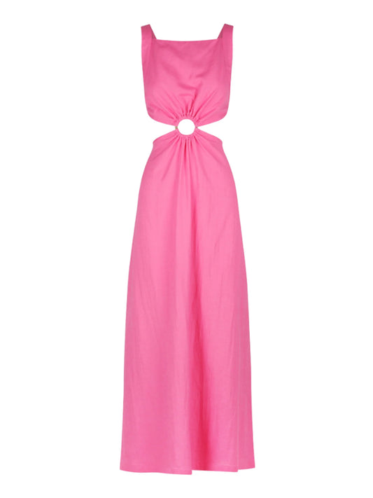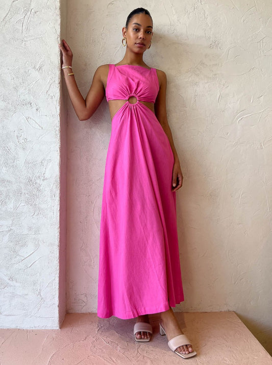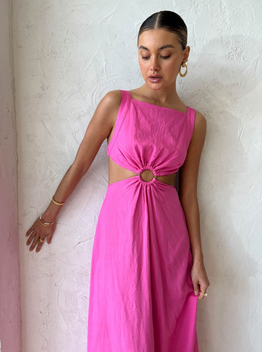 Crafted from a mid-weight breathable Cotton blend in Coco's signature pink. This flattering maxi is designed to sit fitted across the bodice with a square neckline, statement centre front tort ring detail and waist cutouts that follow through to an open elasticated back.