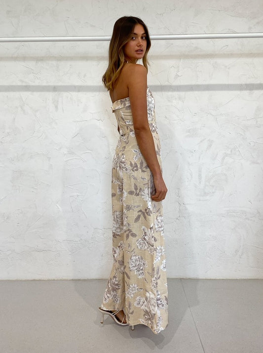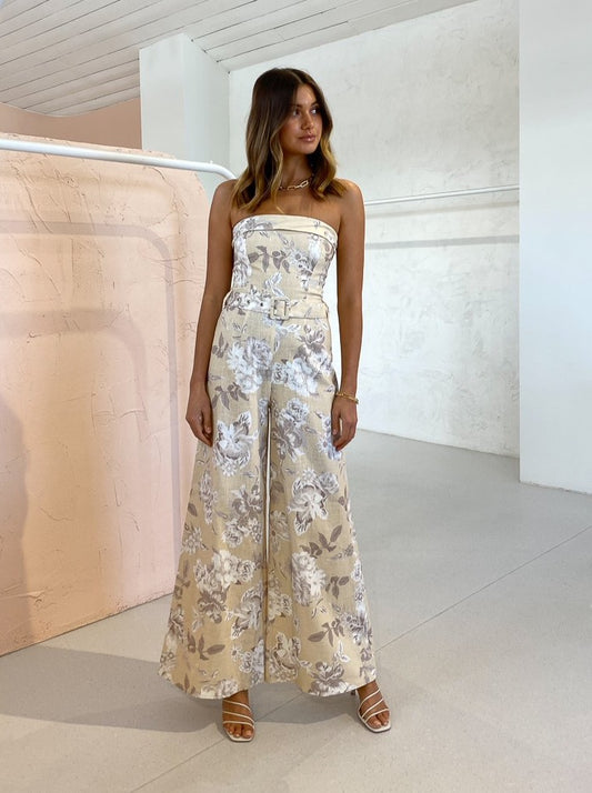 Designed with an exclusive rose floral print, this strapless jumpsuit with structured boning and flared pants will have you look effortlessly elevated at your next event.