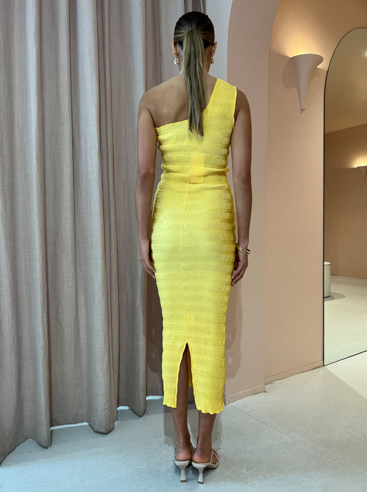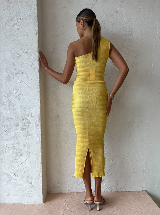 Designed to slip on with ease for, this form fitting one shoulder midi dress is coveted for special occasions. Featuring the signature L'IDÉE WOMAN ribbed pleating through the torso which softens into a relaxed whimsical pleat and finished with a gently fluted hem with side split.