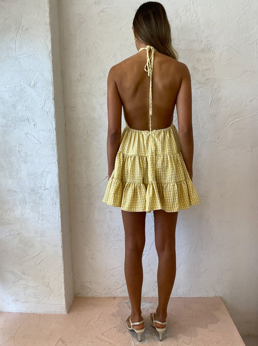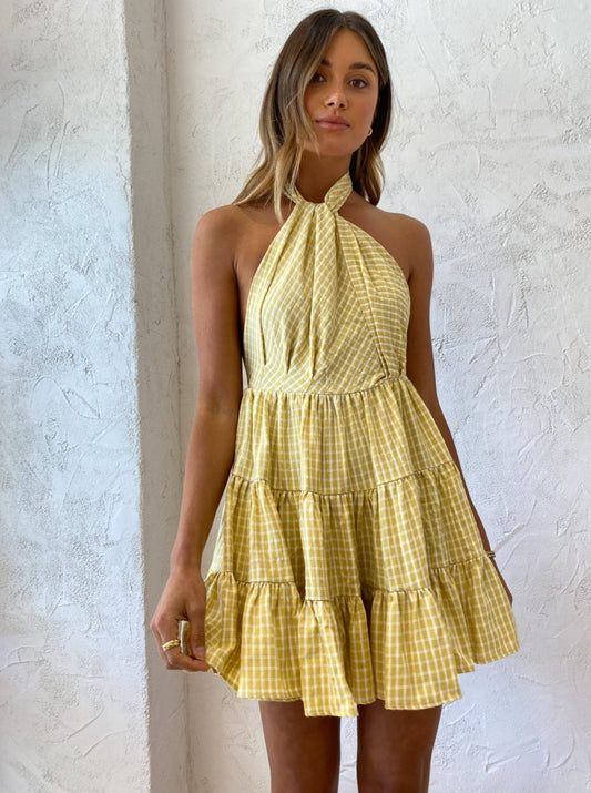 Crafted from a Rayon blend fabrication in a soft yellow gingham print, this mini dress features a knot detail halter neckline, folded draping at the bodice and pleat detailing at the waist to subtly cinch and accentuate the femme form.