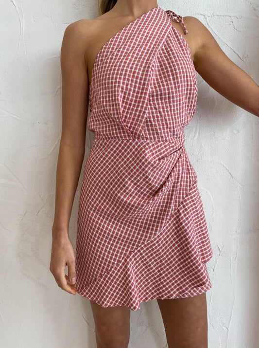 Crafted in a gingham printed fabrication, this mini dress features a one shoulder shoestring tie, pleating and soft ruching through the bodice which falls into a sweet ruffle and slightly flared mini skirt providing a charmingly feminine silhouette.