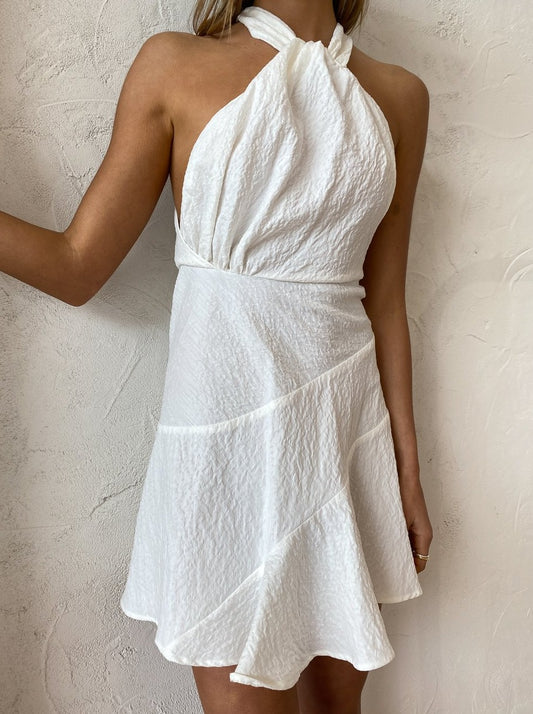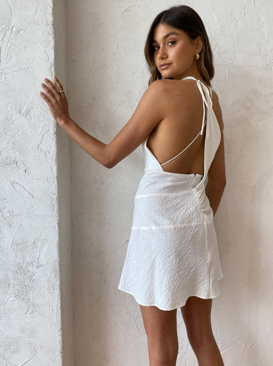 Crafted from a textured cotton fabrication in a crisp white hue, this mini dress features a halter style neckline with an adjustable knotted detail, ruching at the waist to subtly cinch and accentuate the femme form and a bias cut panel for moment to the mini skirt.