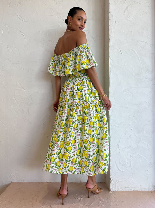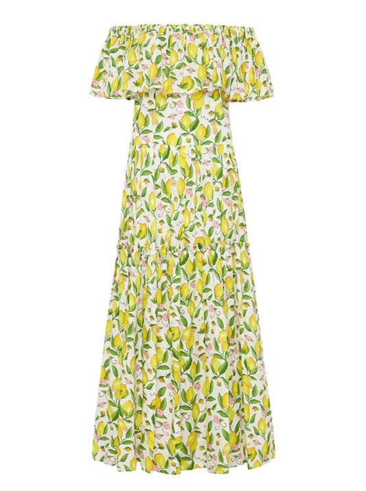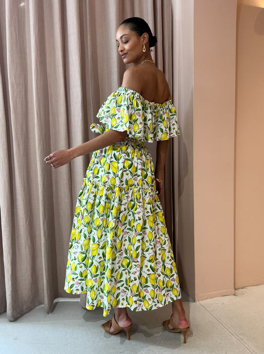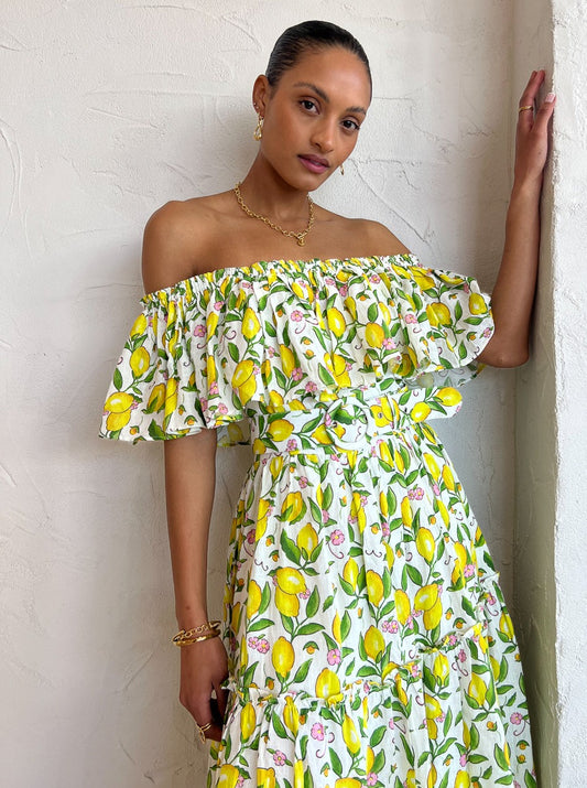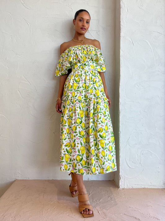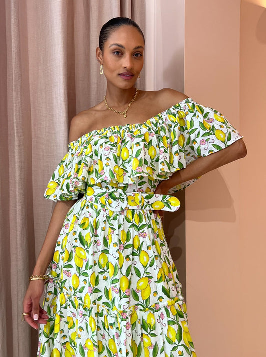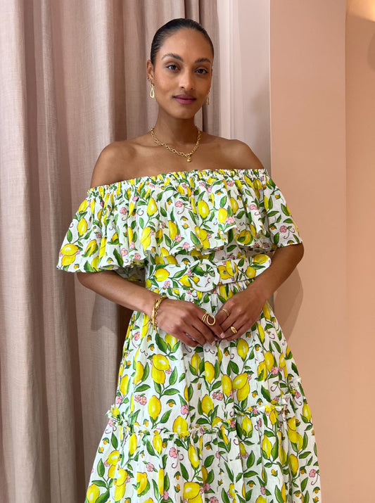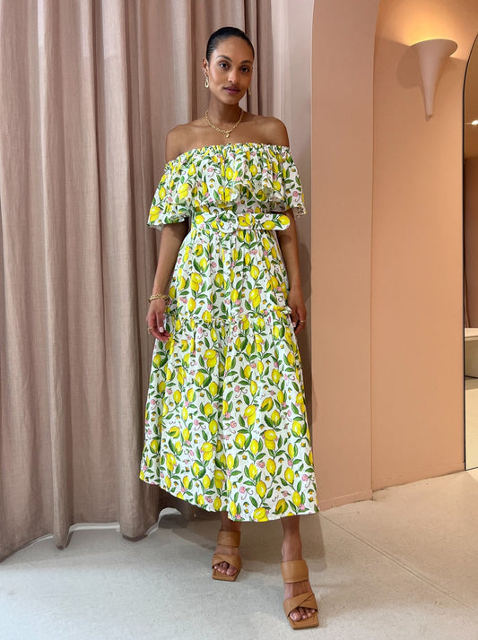 Crafted from a premium Linen fabrication, this off the shoulder midi dress features a statement making hand-drawn lemon print, frill detailing and is finished with a matching eyelet belt.