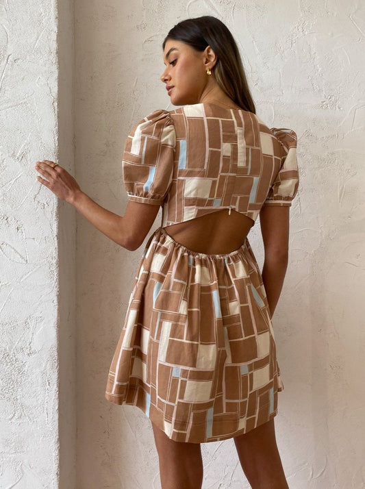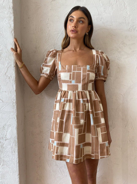 Designed to form and flatter, this mini dress is crafted from a Linen Cotton blend fabrication in a playful geometric print. Featuring flattering short puff sleeves and a square neckline which falls into a gathered mini skirt.