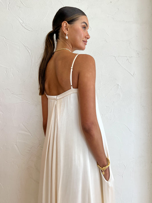 Crafted from a silk-to-touch fabric with a luxurious sheen, this maxi dress features a straight neckline, adjustable rouleau straps and side pockets.