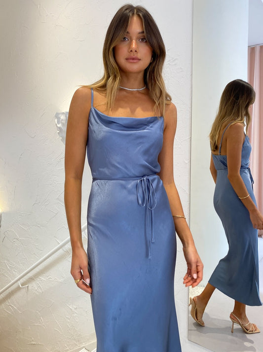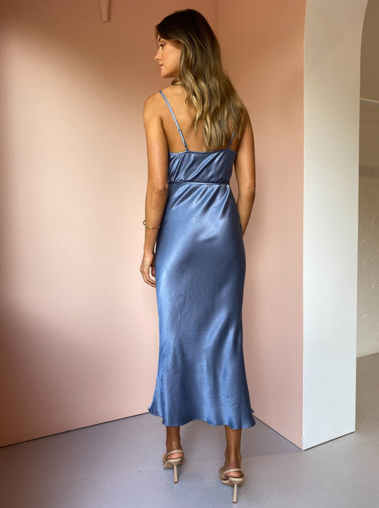 The La Lune Bias Cowl Midi Dress in Blue Smoke by Shona Joy has us effortlessly slipping into endlessly romantic moments.