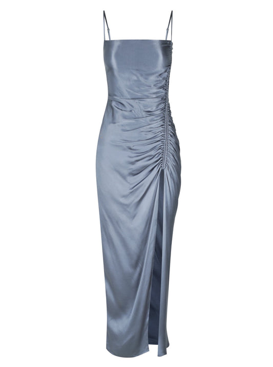 Featuring a square neckline, lace up open back, ruched side detail and a side split, the Giselle is a silky midi length dress crafted from a viscose fabrication.