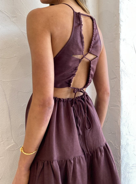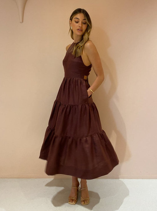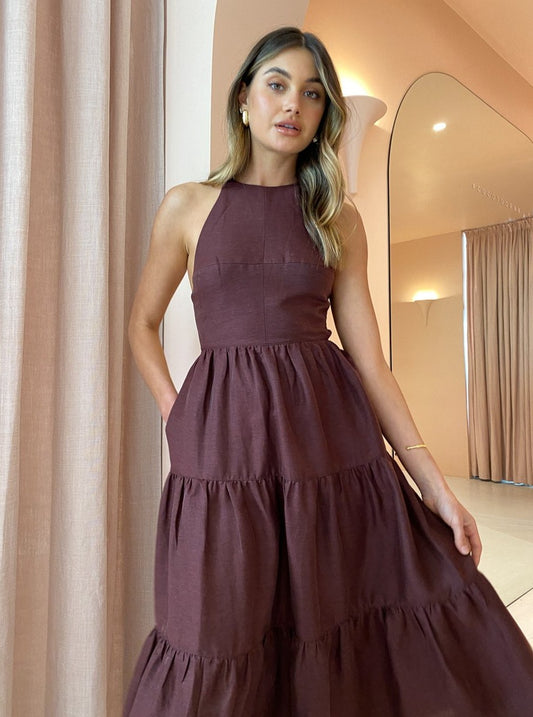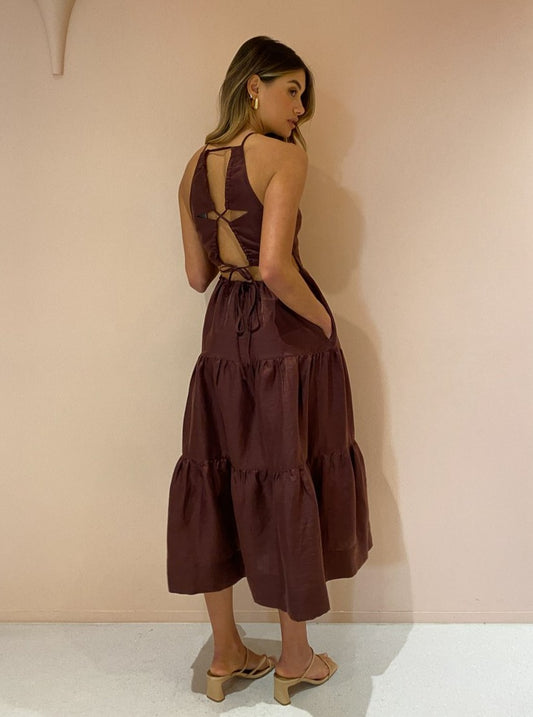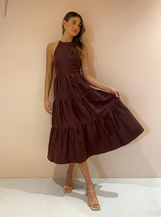 The Marlene Open Back Tiered Midi Dress in Chocolate by Shona Joy has us falling for billowing silhouettes with delicate detailing.