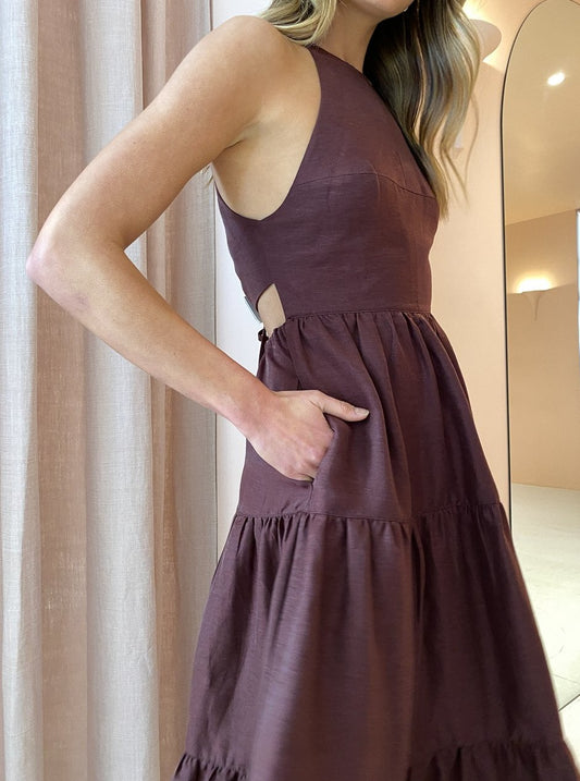 Shona Joy Marlene Open Back Tiered Midi Dress in Chocolate