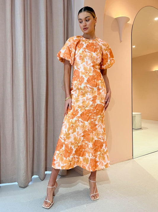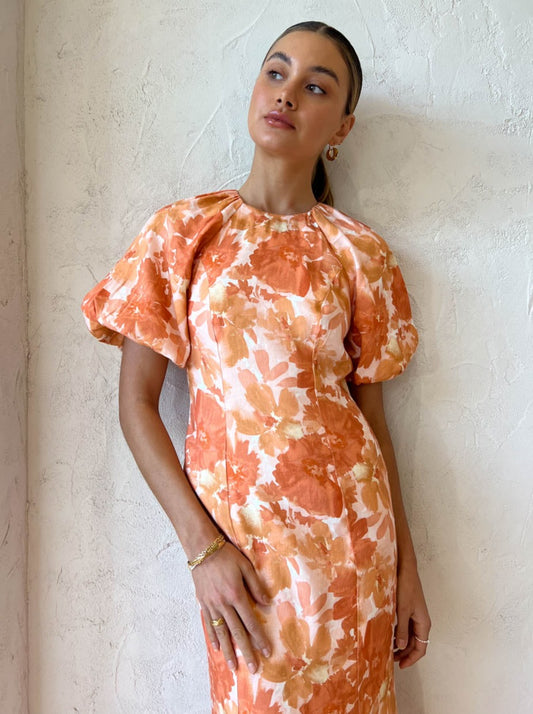 Delicately crafted from a lightweight linen blend and printed in a warm floral print, this midi dress slips on with ease. Featuring a round neckline and romantic puff sleeves, its tailored through the bodice before falling into a floaty hemline.