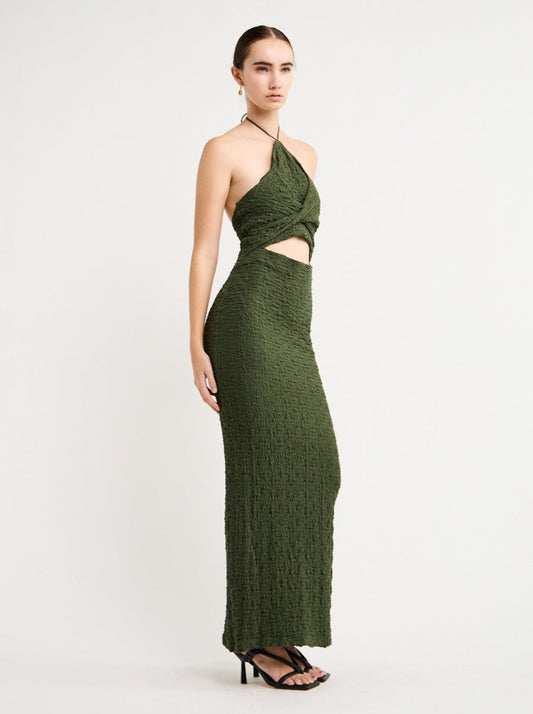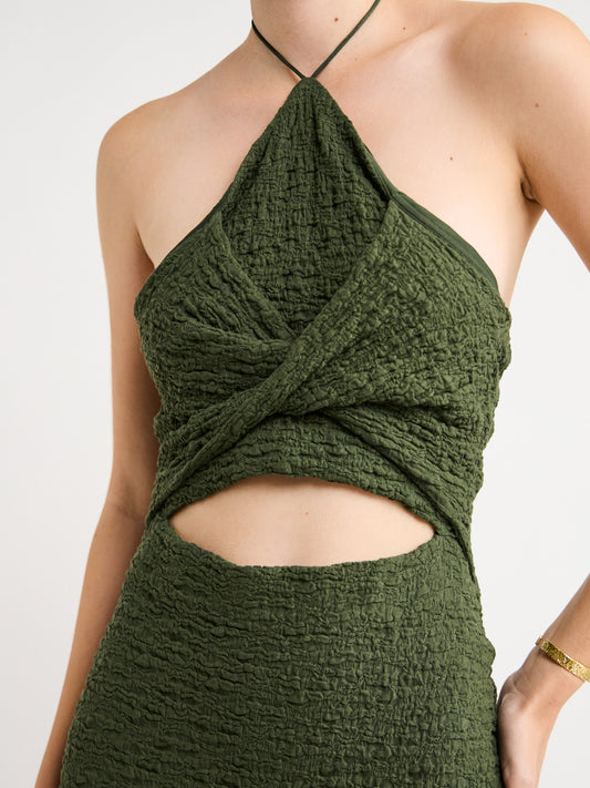 Crafted from a luxe cotton blend, this halter dress features adjustable ties and an exquisite twist front bodice detail with a front cut out.