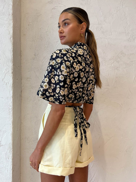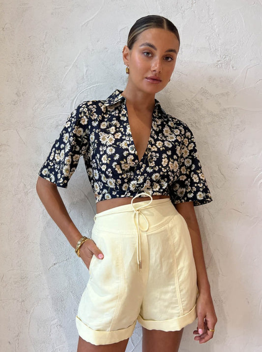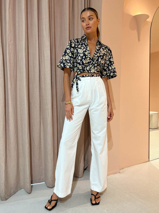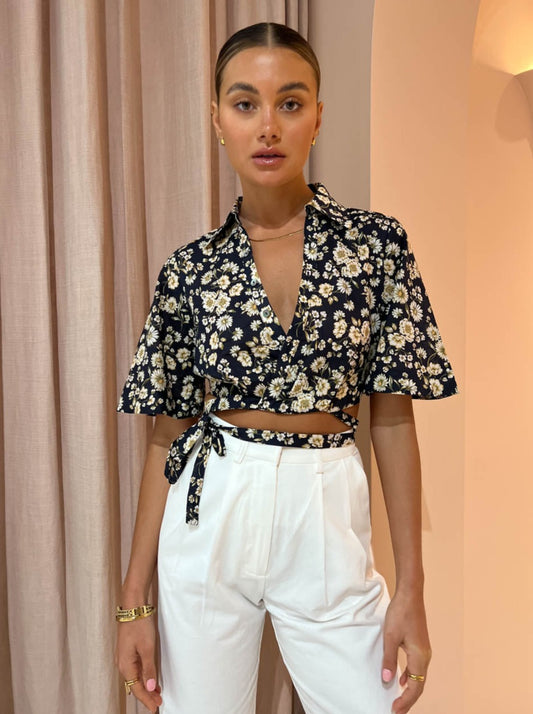 The Philippa Shirt in Midnight Daisy from Significant Other is an elevated reinvention of the classic wrap top.