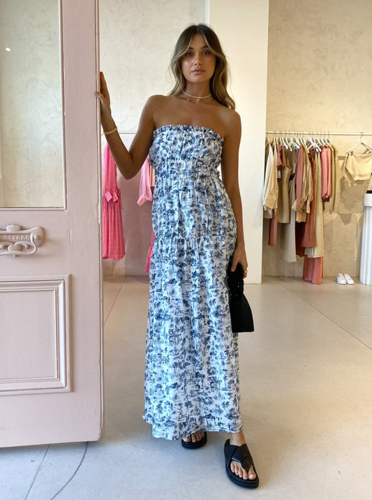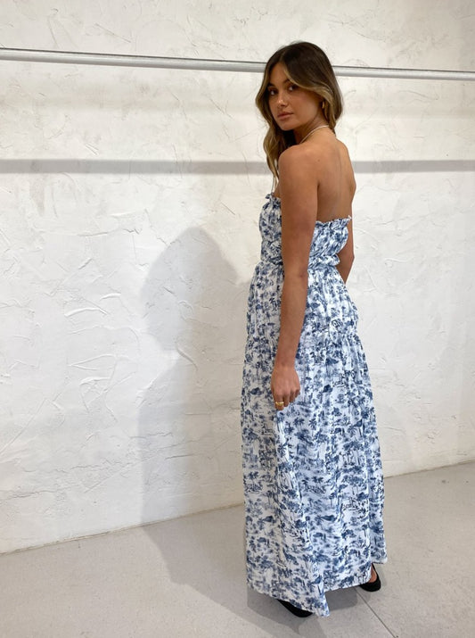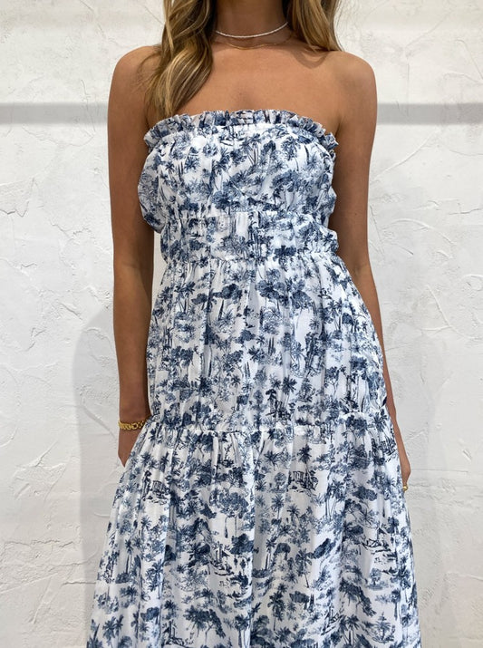 SIR. have us daydreaming of endless seaside escapes and tropical paradise getaways every time we slip on the Dimitri Strapless Dress in Dimitri Print.