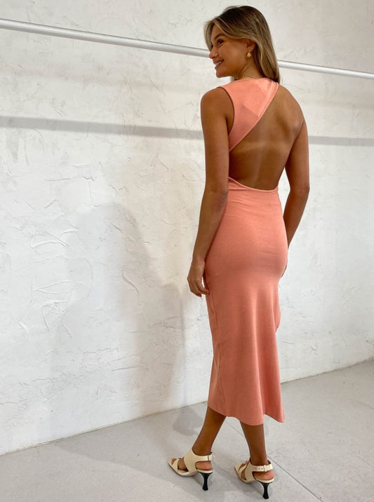 This exclusive midi features a scoop neck line, side split and statement asymmetric cutout back detail with an elasticised waist.