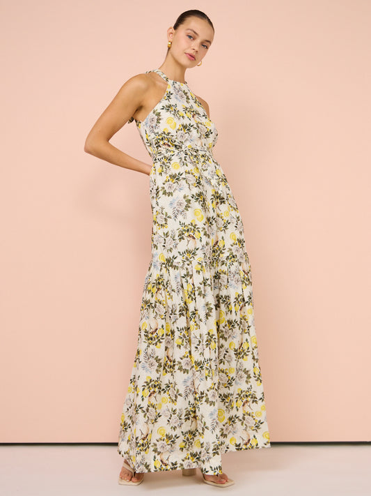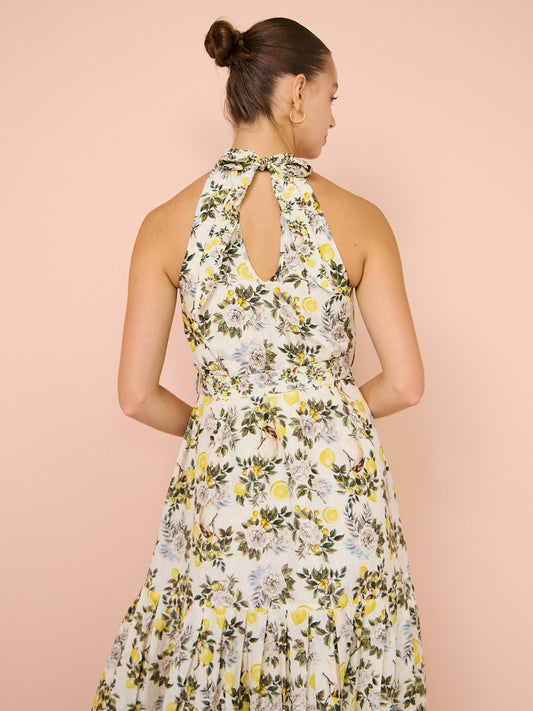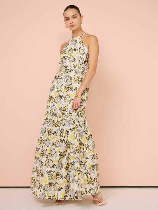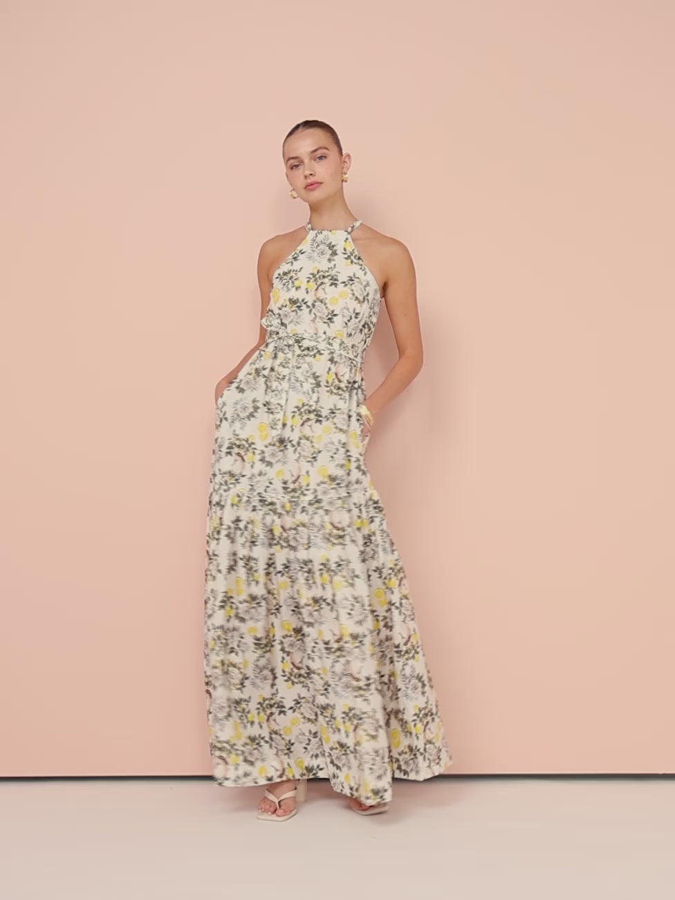This maxi is adored for its halter-neck style, subtle back-open detail, and functional pockets. The self-fabric tie adds shape and dimension to the effortlessly breezy a-line skirt.