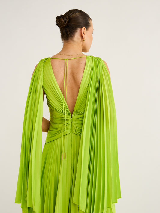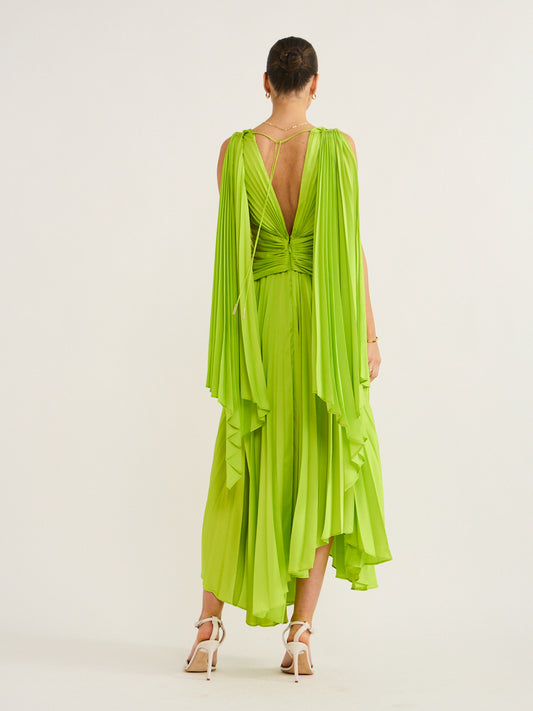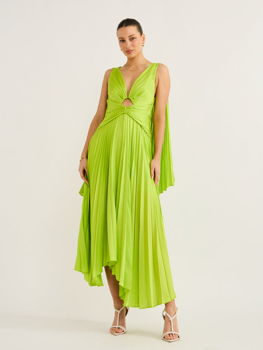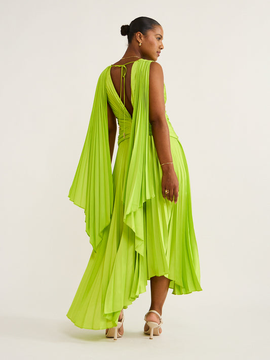 Crafted with Acler's signature pleating and gold hardware, this vibrant midi dress features a plunging neckline and an asymmetric hemline that creates a look of bold elegance.