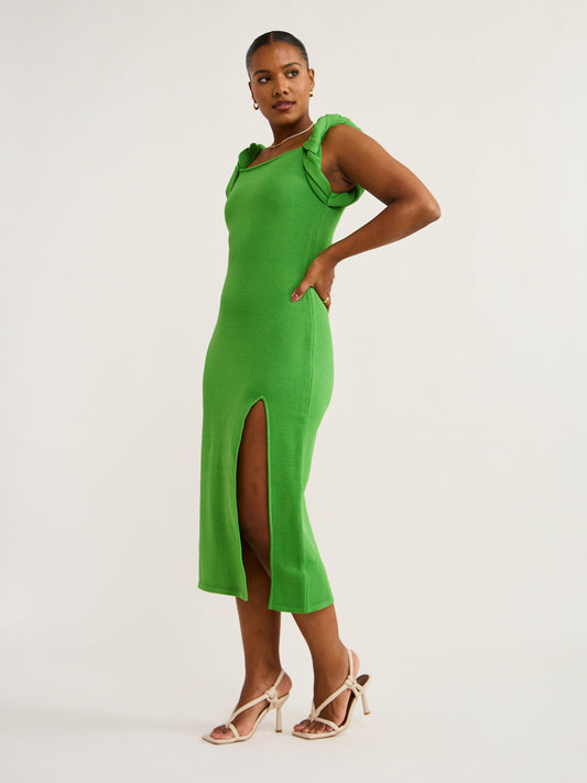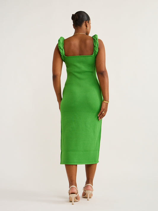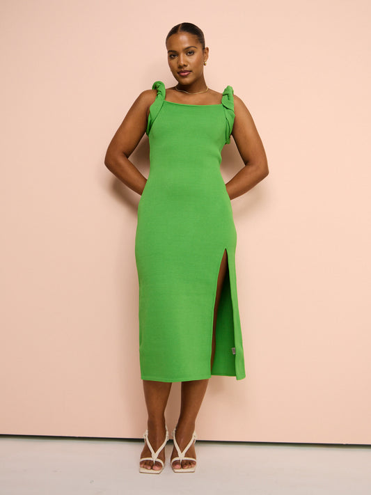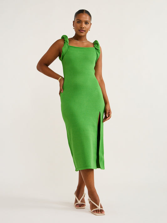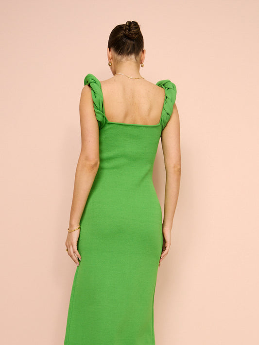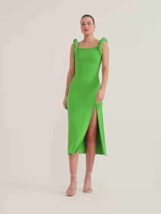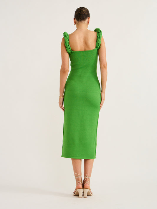 Meticulously crafted from a crepe knit fabrication featuring a hint of stretch, this form-fitting ankle length dress offers a twist-strap detail and a statement hemline split.