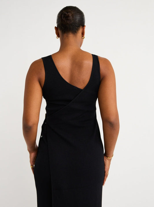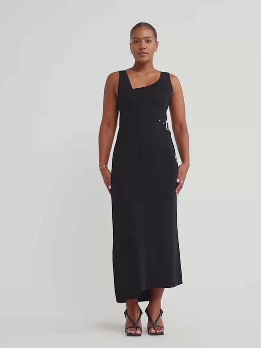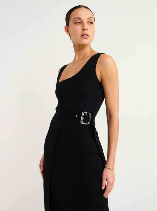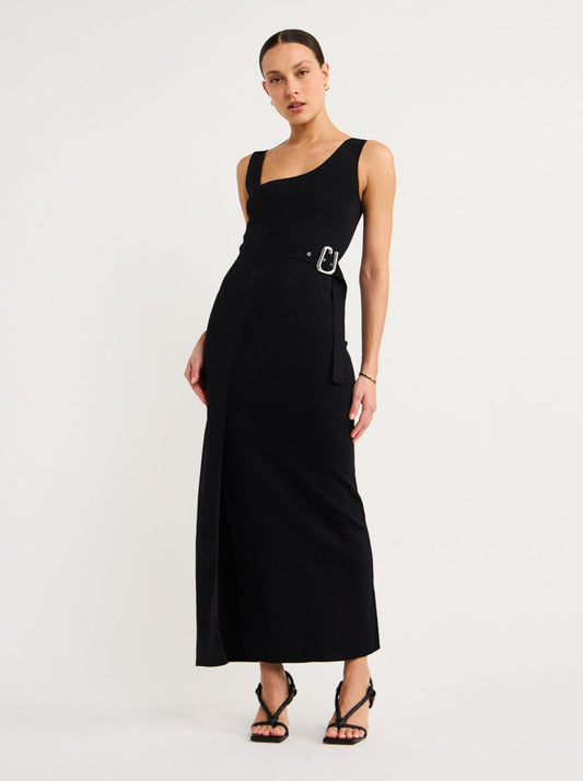 Crafted from a mid-weight knit for a sleek fitted silhouette, this luxe midi features an asymmetrical strap neckline, a front wrap construction, and a custom SIR. metal buckle detail.
